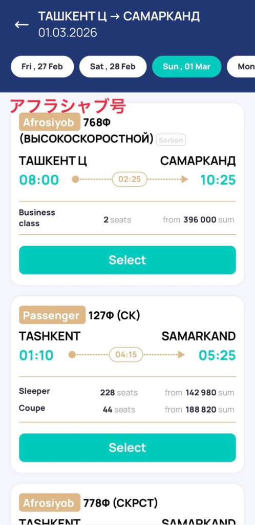 Afrosiyob(アフラシャブ号) が高速列車です。