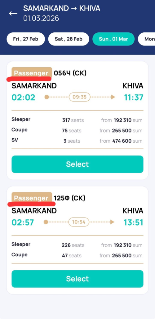 ヒヴァ方面の列車は本数が少なく、片道10時間ほどかかるので、寝ている間に移動するのがベストだと思います。実際、検索をかけたこの日も深夜発しかでてこずでした。
