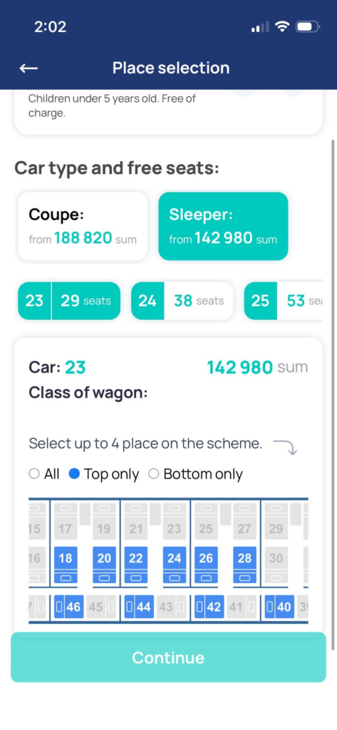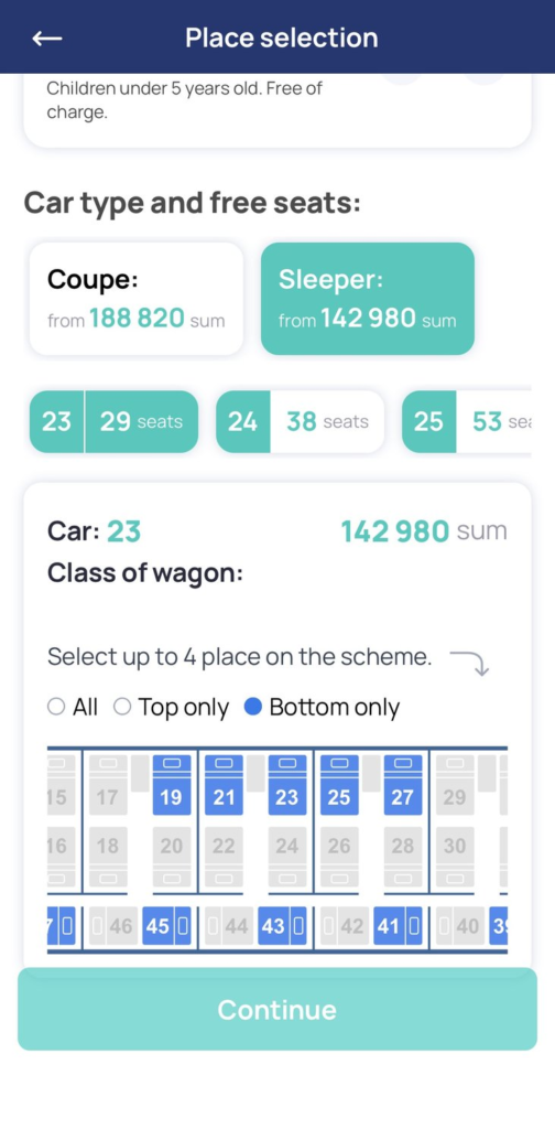 SleeperとCoupeの場合、 上段(Top)と下段(Bottom) の2種類のベッドがあります。上段は一度登ると降りにくいので、Bottom(下段)を選ぶのがおすすめ!!下の段が奇数の席番です。選択時は注意してください。