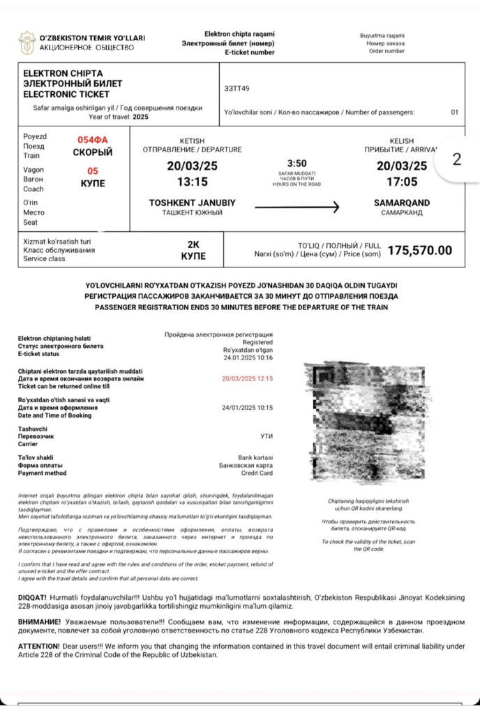 予約が完了すると、電子チケット(予約票) が表示されます。ウズベキスタンは電波が弱い場所が多いので念のため印刷して持っていくのがおすすめです。