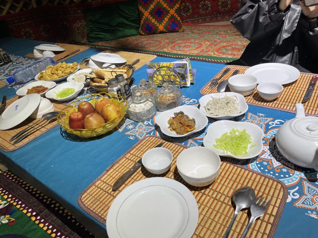 砂漠でたくさん遊んだ後、スタッフに呼ばれて宿泊者みんなでウズベキスタン名物料理を食べました。なんと半分以上が日本人でした。