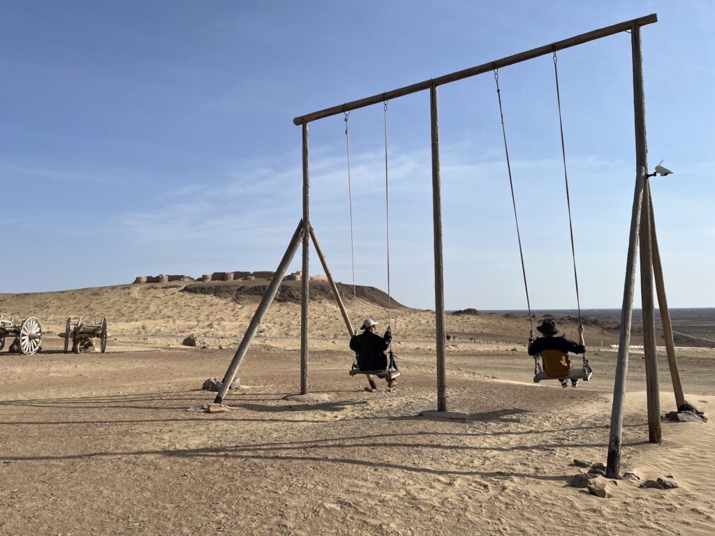 ユルタの前には砂漠に向かって漕げる巨大ブランコ。