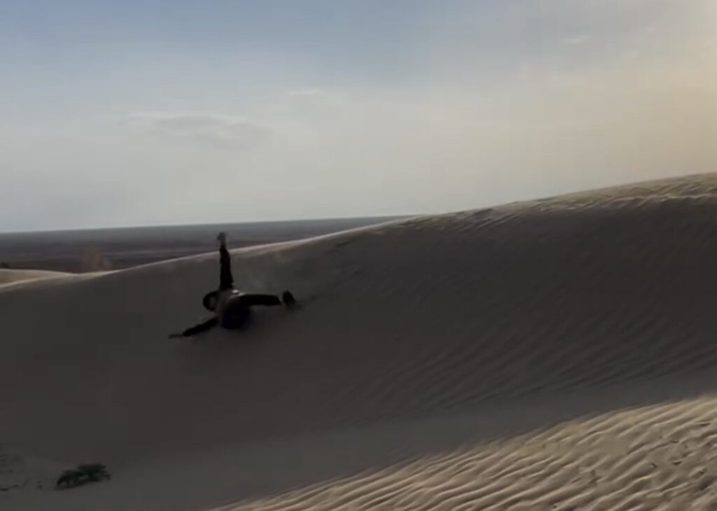 「せっかく中央アジアの砂漠に来たんだから」と謎の使命感が湧き、なぜかVIVANTの世界観をイメージしながら砂丘を転がり回る大人。普段なら絶対しませんが、このあと妻も転がり回りました。