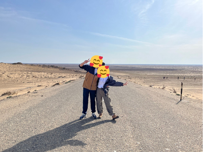 砂漠の一本道に立つと、視界の端から端まで地平線。日本ではまず見られないスケールの大地に、中央アジアに来た実感が湧きました。