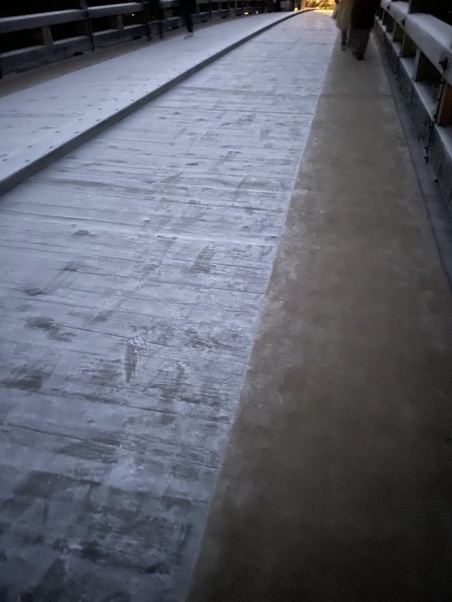 宇治橋は霜で滑るため、みんな橋の滑らないところを歩いていました。