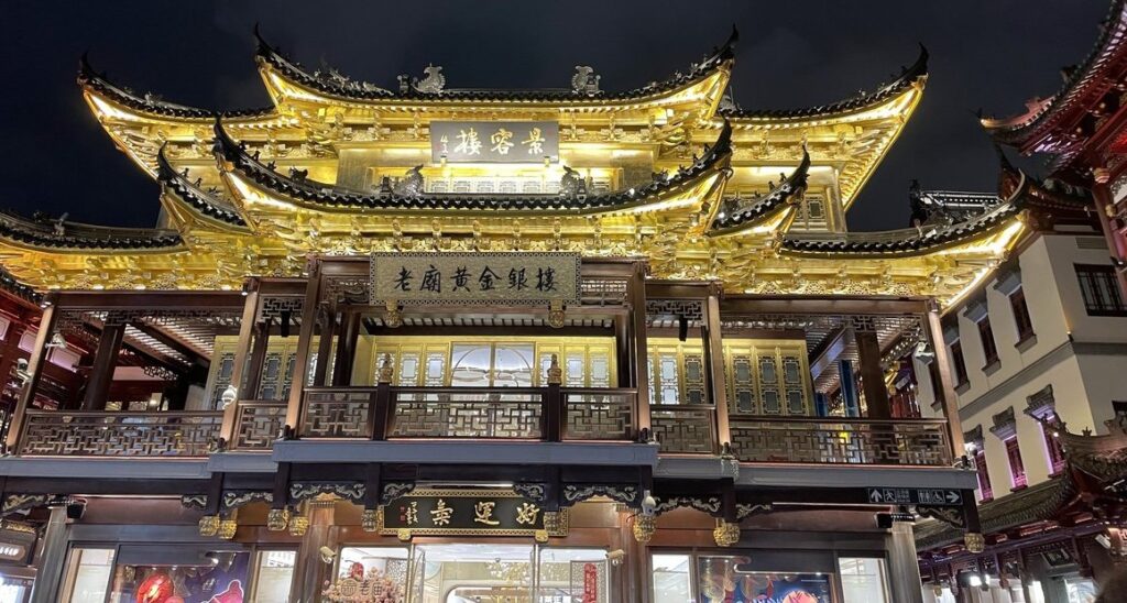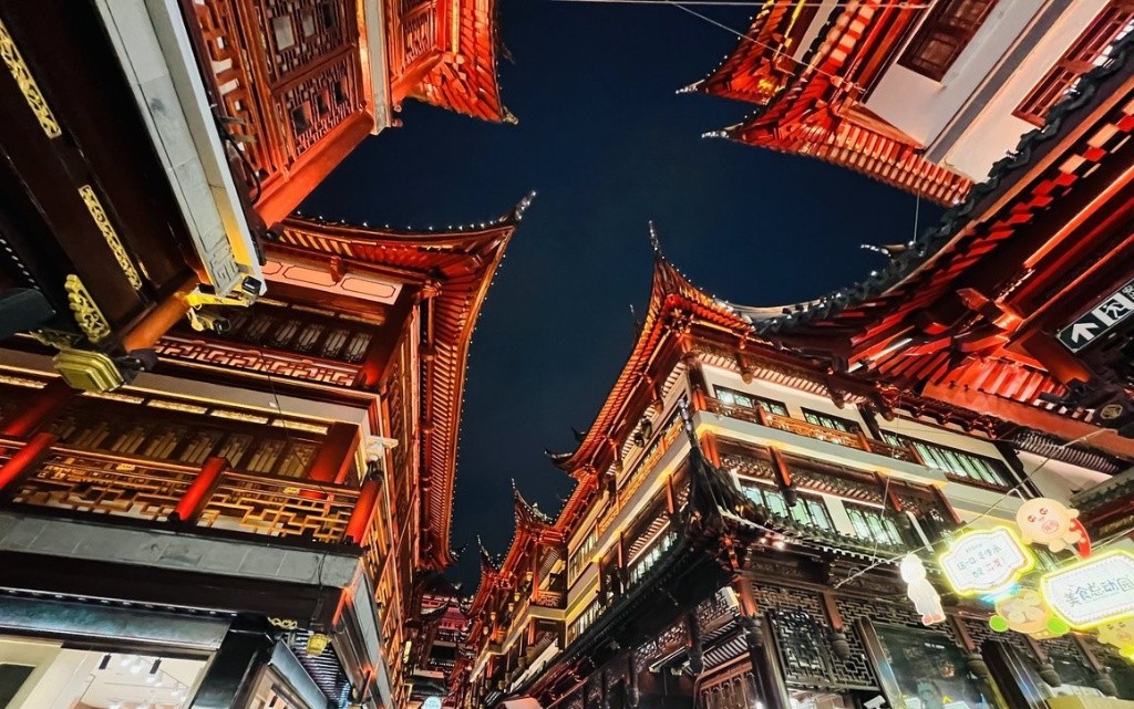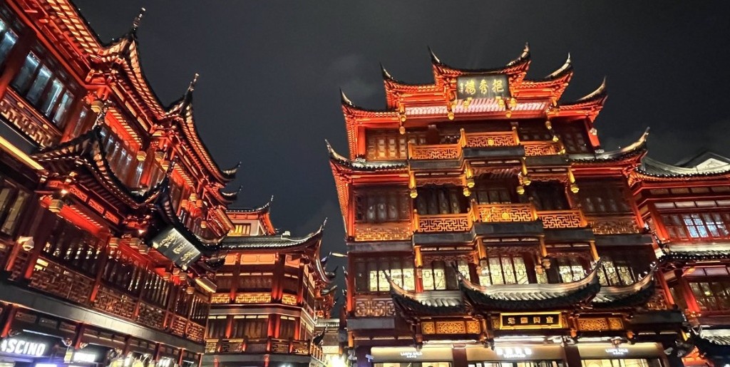 昼間の豫園も趣がありますが、真骨頂はなんといっても夜です。 日が落ちると、伝統的な中国建築の軒先が一斉にライトアップされます。その光景は、まさに映画『千と千尋の神隠し』や『レトロフューチャーな異世界』に迷い込んだかのよう。