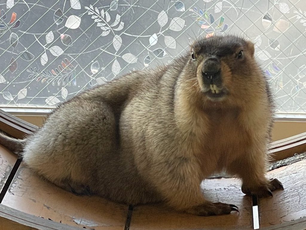 入り口付近の看板にはキャッチーなマーモットのイラストがあり、